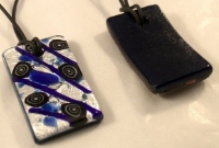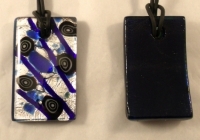 Glass Rectangle Pendant of fused murrine glass. (In this case it is called murrine since there is no "flower", rather abstract designs in the cane.) You can use a half hitch with your cord of leather through this hole easily. The back side has a slightly textured effect which it gets from sitting on the kiln fiber during fusing. The back of the red one is shown and the back of the silver/black is a black. They are made sandwich style, where the bottom layer sits on the kiln fiber shelf, and then the silver foil and a final toping of transparent clear Moretti glass. The fusing process takes the glass not quite to the fluid state and fuses the layers together.