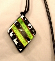 Fused Glass Pendant with the hole on the triangle to give you a diamond shape. The pendant is fused with two layers of Murano Glass. These pendants are slumped after the fusing to give them slighty curved shape which helps hold the pendant close to the body and sits on the cord nicely. The back side of each pendant is solid dark blue. Both silver chain and black cord are 18".
