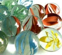 1" transparent clear with orange, yellow, blue, green swirls glass marbles