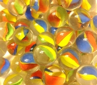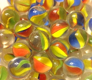 Dazzling, stunning and shiny clear marbles with multiple colors swirls. • Perfect for all your arts & crafts and DIY projects. • 5/8” (16mm) size, used as “mibs” or “ducks” in those classic marble games. • Machine made in China.